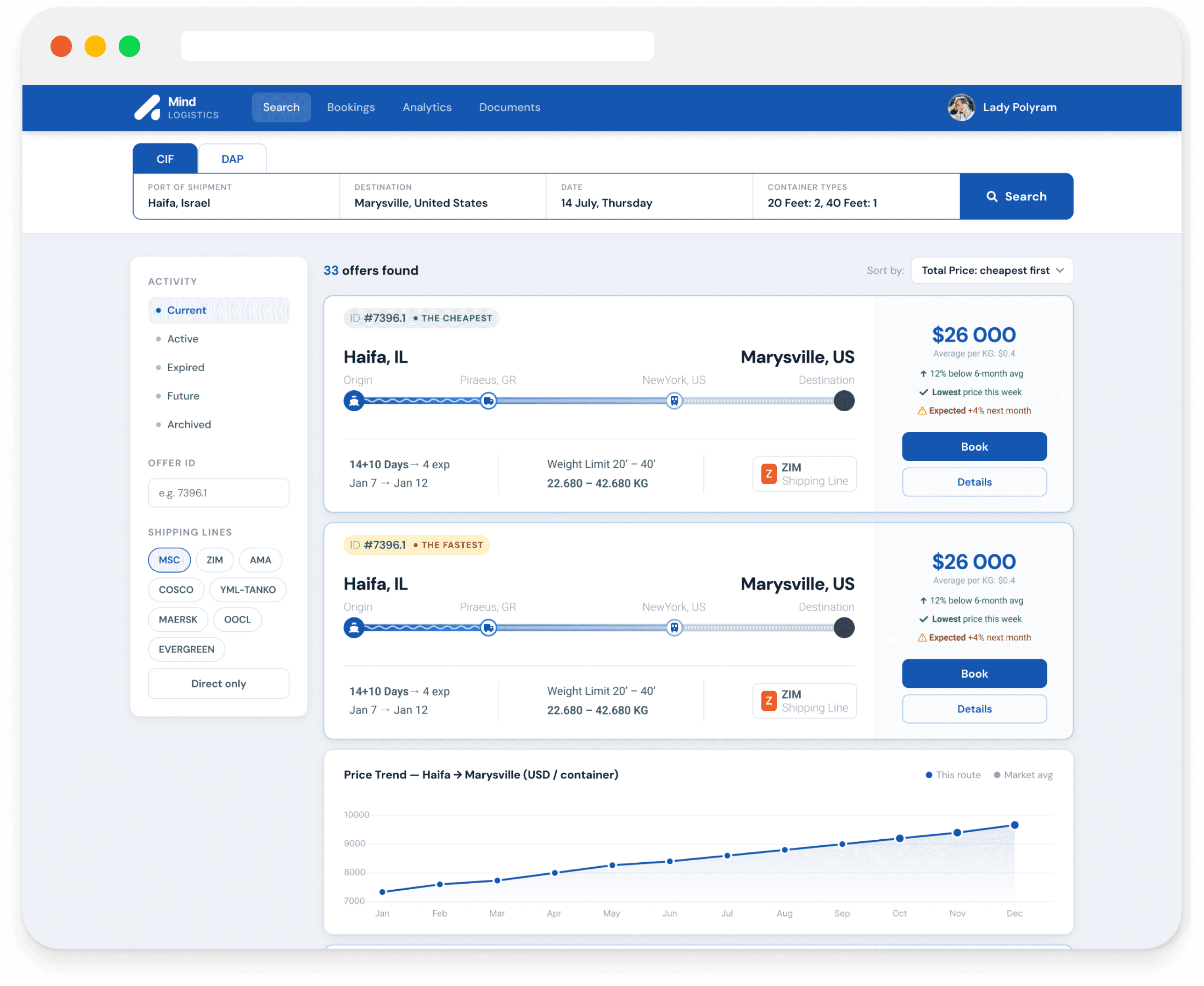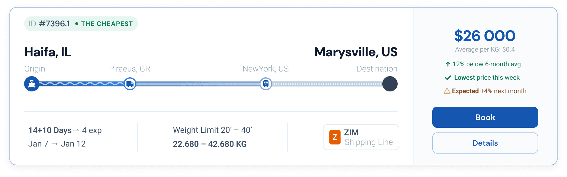Origin, destination, date, container type. No hunting for the right screen.